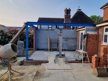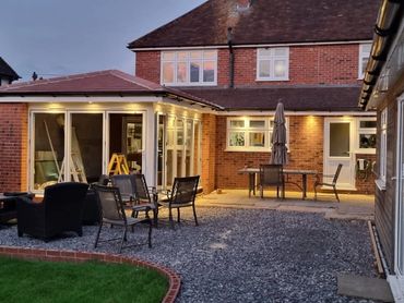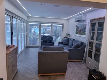 Orangery extension, in this project we had to remove the old decking dig out and pour the concrete footings, install the steel frame work, build the cut roof and fit 2 sets of aluminium bifolding doors with blinds within the double-glazing, the inside was fitted out with intelligent flush fitting led lighting strips, ceiling mounted bluetooth speakers, underfloor heating and air conditioning